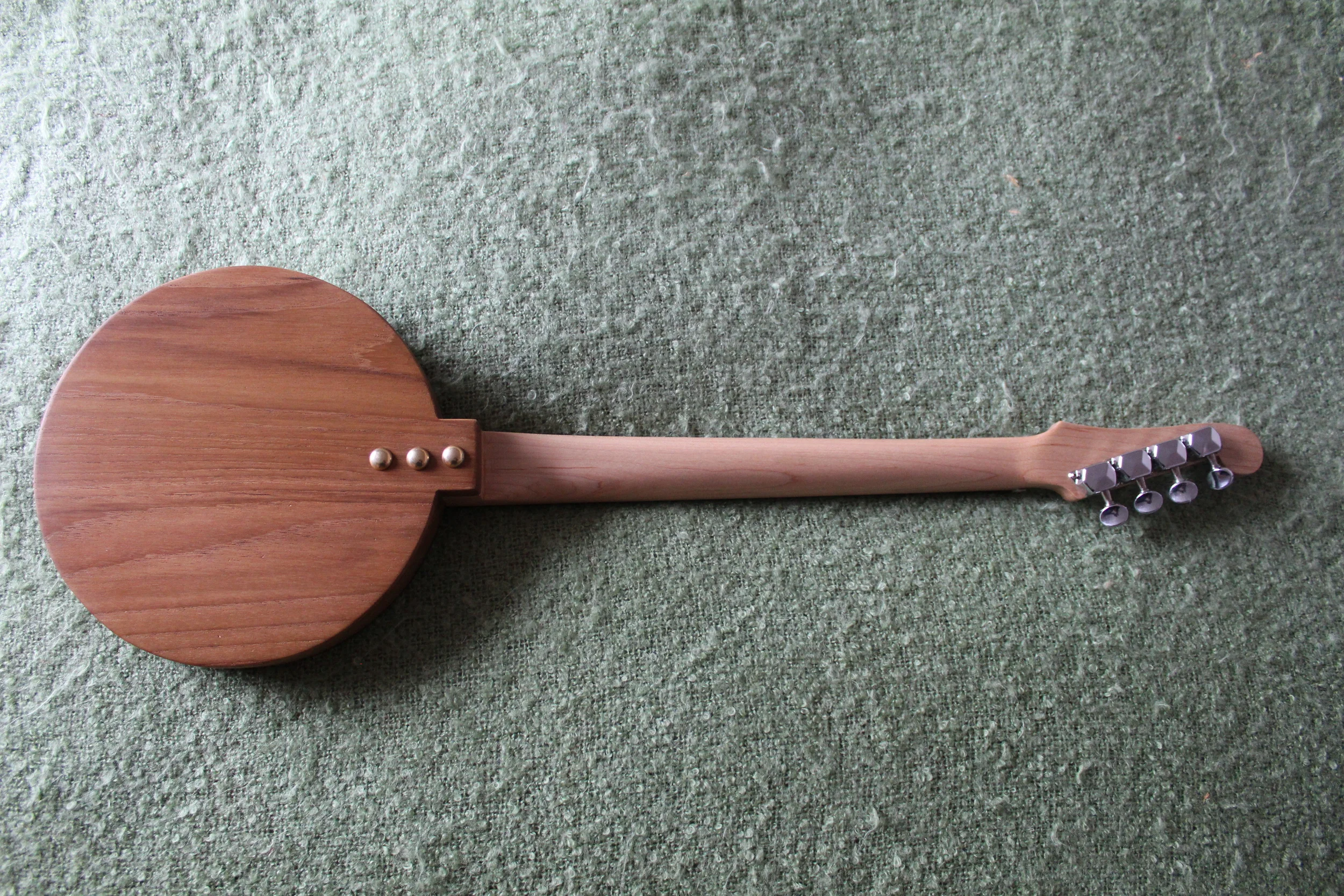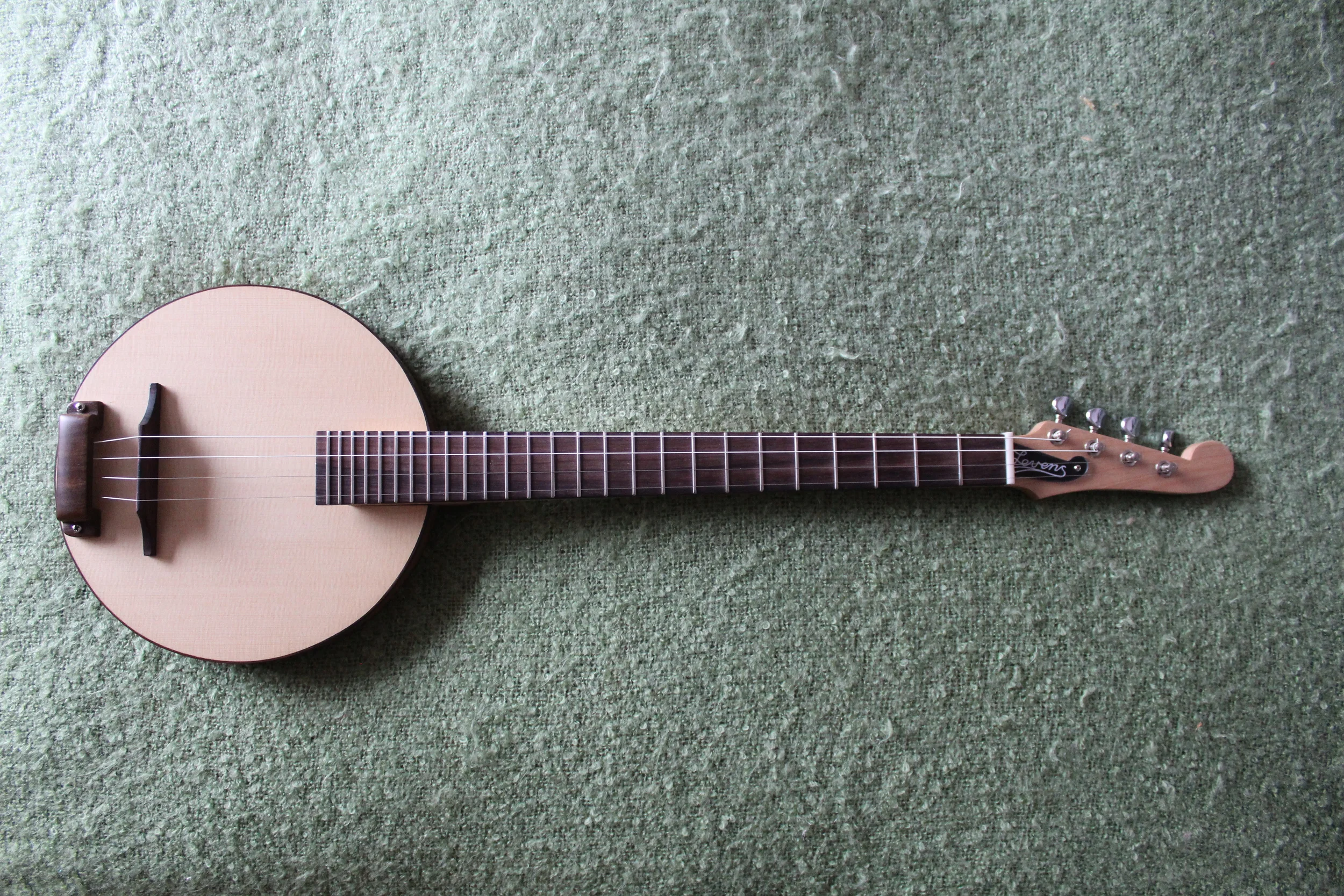 Special production presentation four string tenor practice banjo with chambered teak body topped by a spruce skin. Maple neck with rosewood fingerboard. Rosewood binding, bridge and tailpiece cover. Oiled finish.