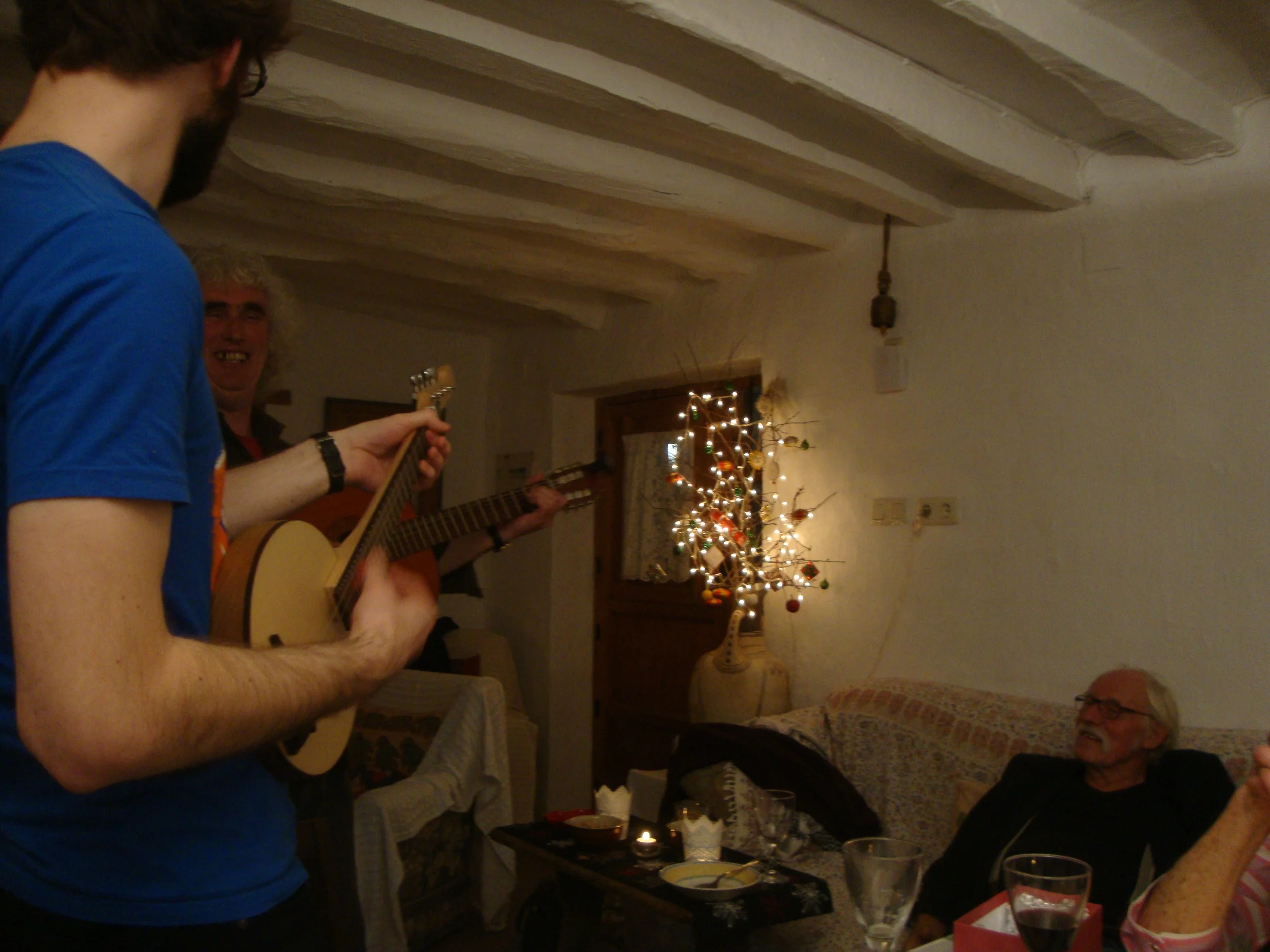 Captain David Ritchie (seated) being demonstrated the banjo in Casa Rosina, El Toril, Andalucia 2015, at the presentation of the instrument. David played the banjo for many years, but was without an instrument when I met him. This instrument hopefully will allow him to practice quietly in the corner until he feels confident enough to fit a couple of humbuckers and buy a Marshall stack.