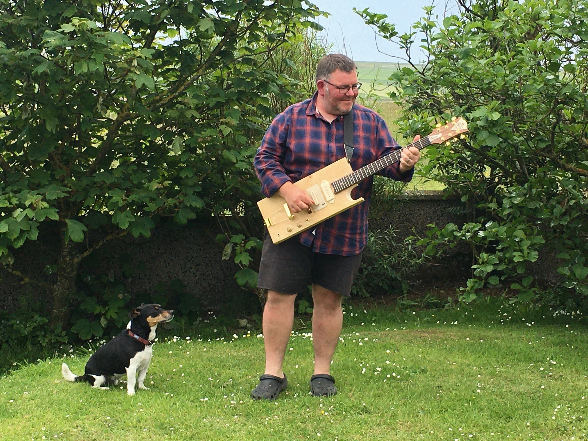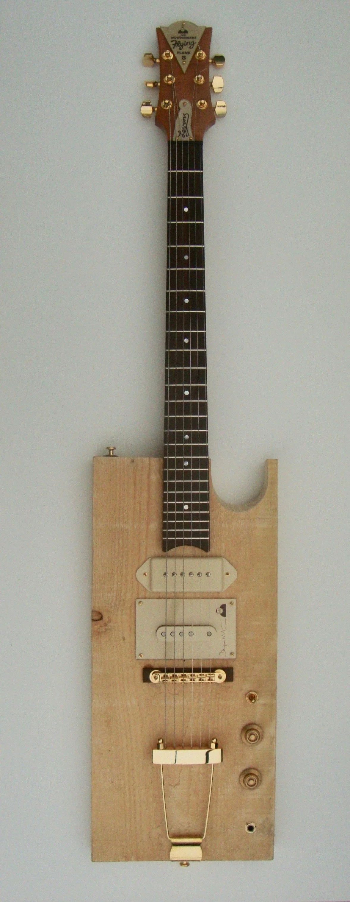 This is the third Flying Plank made to date. Commissioned by Orcadian musician Douglas Montgomery, a long time fan of the original instrument, 2021 saw the delivery of this guitar. It differs from the original in the fact that, as well as the Seymour Duncan stacked humbucker, it has a “dog - ear “ pickup in the neck position. Of uncertain origins, (Douglas had it lying around….) whatever it is, it is LOUD. A three way switch links the two. A cherry neck with a rosewood fingerboard, Gotoh tuners, gold plated hardware, Nashville style bridge with a trapeze tailpiece and the obligatory six inch nail ( 22k gold leaf) strap buttons complete the picture.